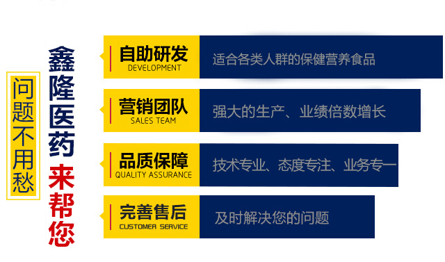鑫隆公司在保健食品的板块中,以“技术、态度专注、服务专一”为公司理念,作为行业当先的适合各阶段年龄饮料和固体饮料及保健食品家,在不同营养领域和保健食品研发生产更适合各年龄级段和各界人士的保健营养食品,竭诚为新老客户服务,多年来深受广大用户的爱护和支持,我公司将一如继往的本着共享共赢的原则,愿与各界同仁共创伟业。